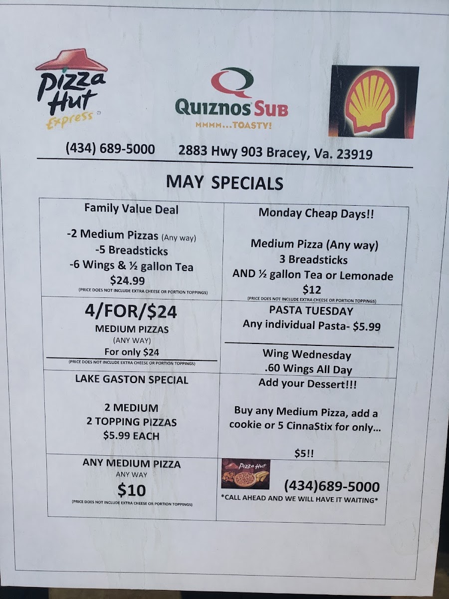 Nestled in the convenient Shell Slip In at 2883 State Rte 903, Bracey, VA, Pizza Hut Express invites you to enjoy delicious cuisine on-the-go. This express location offers a delectable array of pizzas, perfect for fueling up during your travels. Customers rave about the quick service and cheese pull that keeps pizza lovers coming back for more. With a focus on both quality and speed, you can indulge in your favorite slices without delay.